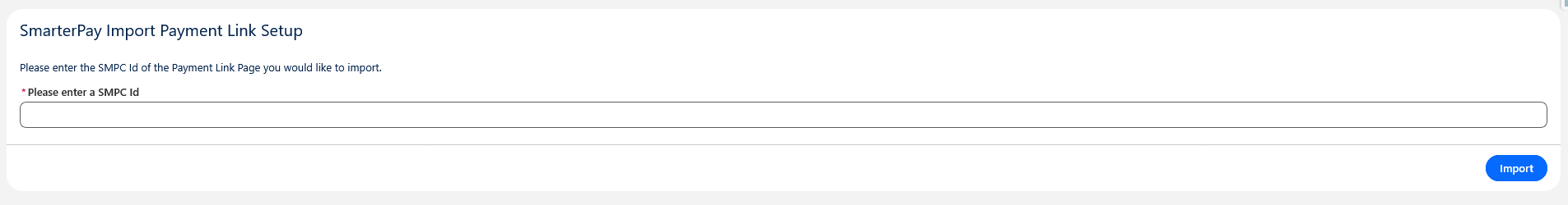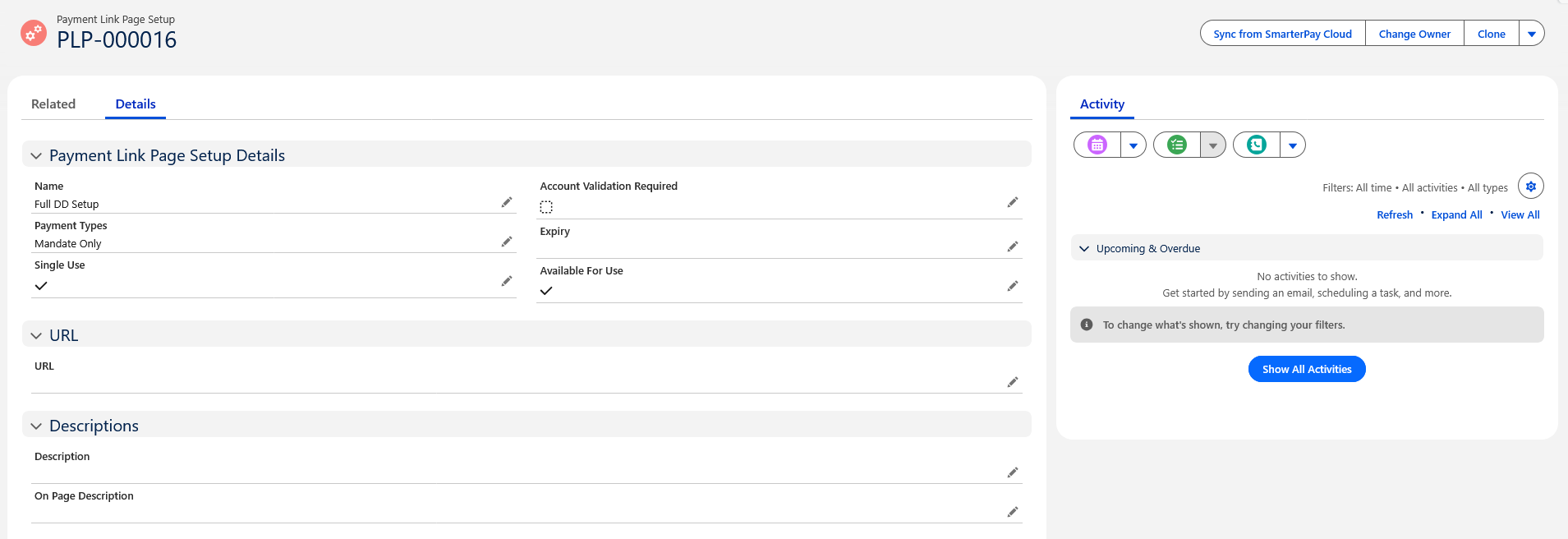 - Once a SMPC Id has been provided this will generate a Payment Link Page Setup in salesforce mirrored from SmarterPay Cloud.
