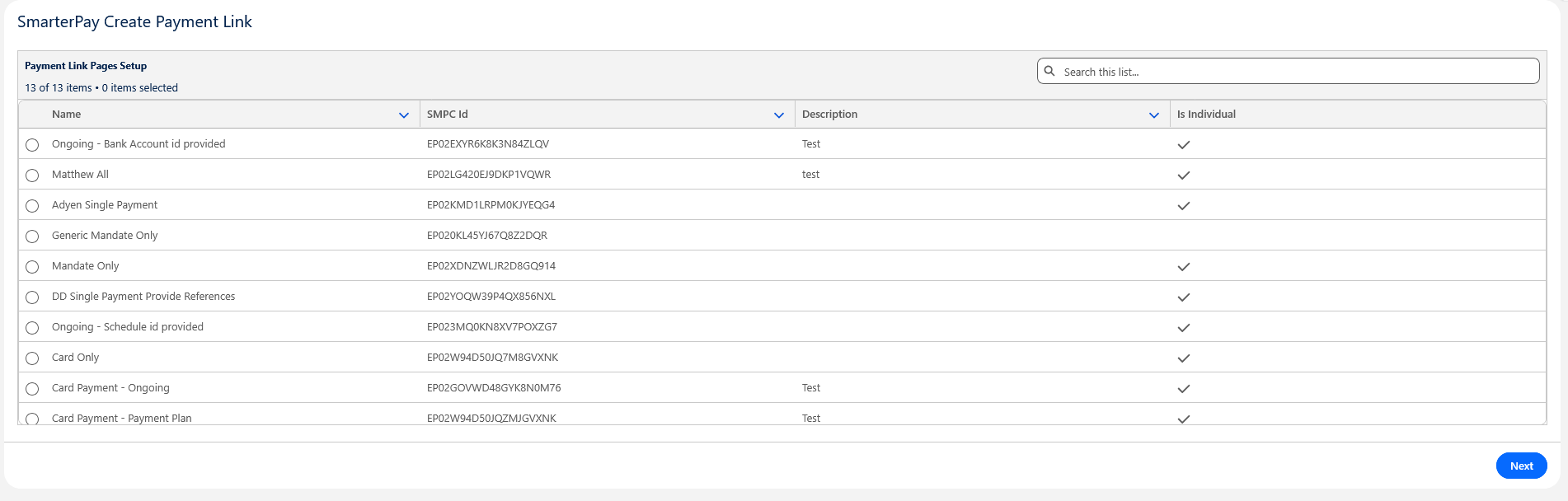 - Selection: Choose the appropriate Payment Link Setup Page. The interface displays the Name, SMPC ID, Description and if it is Individual or not for verification.