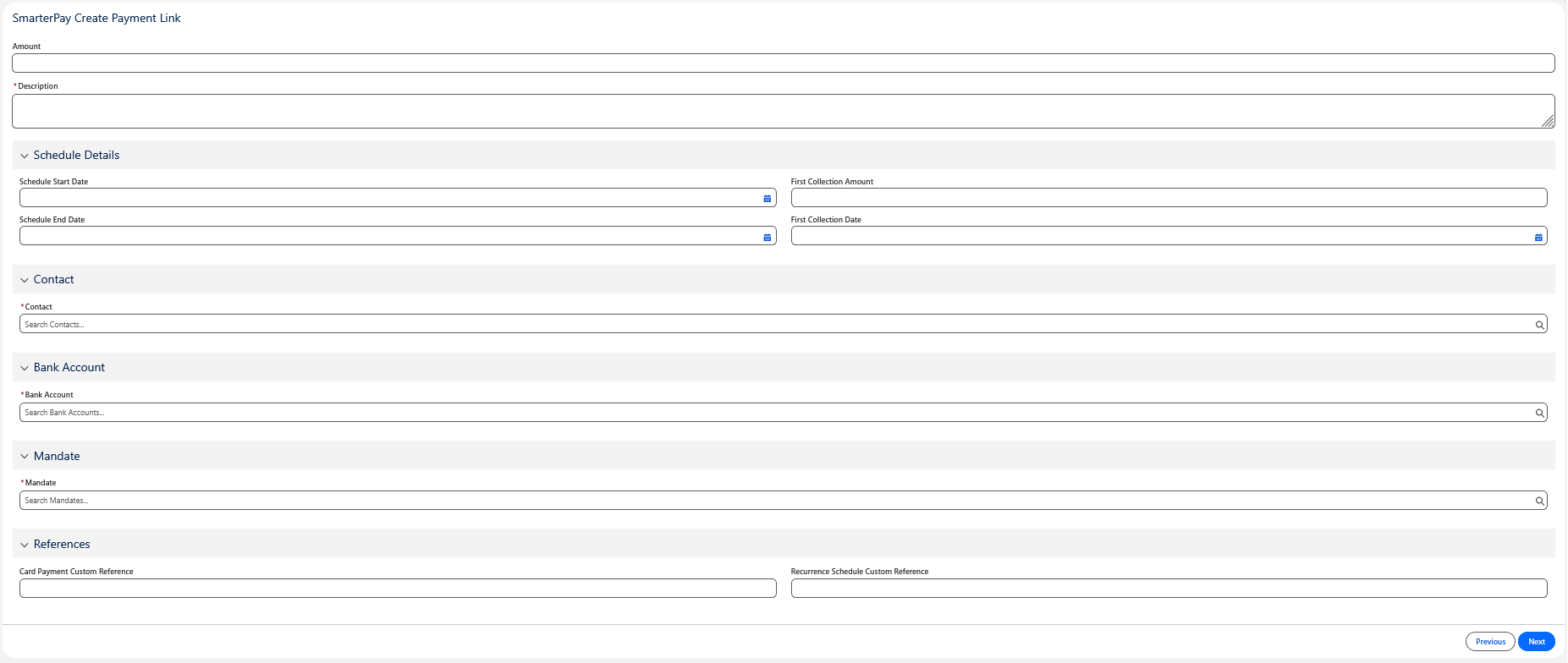 - Data Entry: Provide a description and relevant references. You may associate the link with a Contact, Bank Account, Mandate, or Recurrence Schedule as required by your business process.