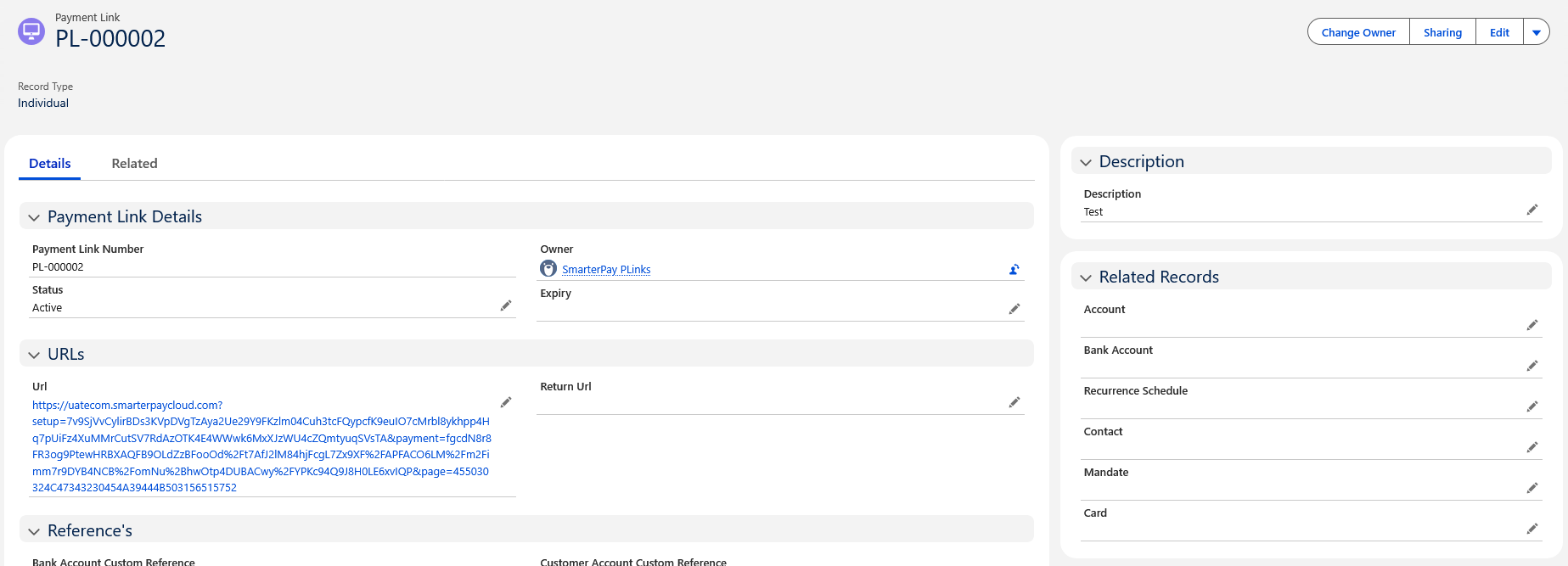 - Processing: Upon saving, the record synchronizes with SmarterPay. Once processed, the unique URL is appended to the record.