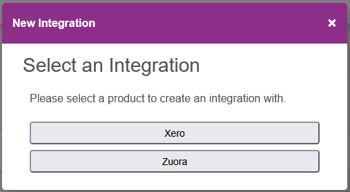 Clicking the “New” button will show any integrations that are availble to be setup. Currently only one of each integration is support for each client.