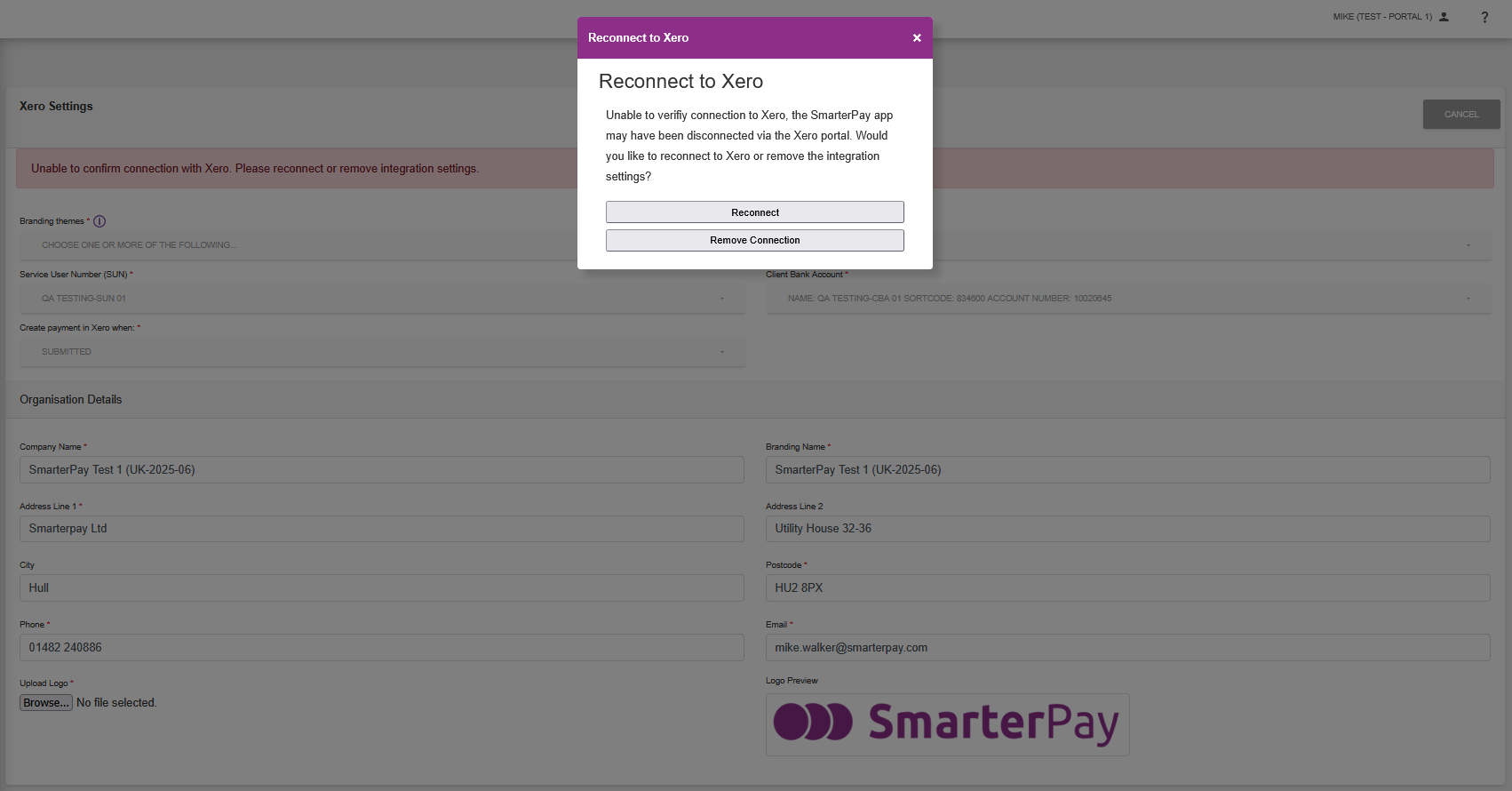 If there is a problem with SmarterPay accessing Xero, for example if the integration has been removed from the Xero end, a message is displayed on the integration record.