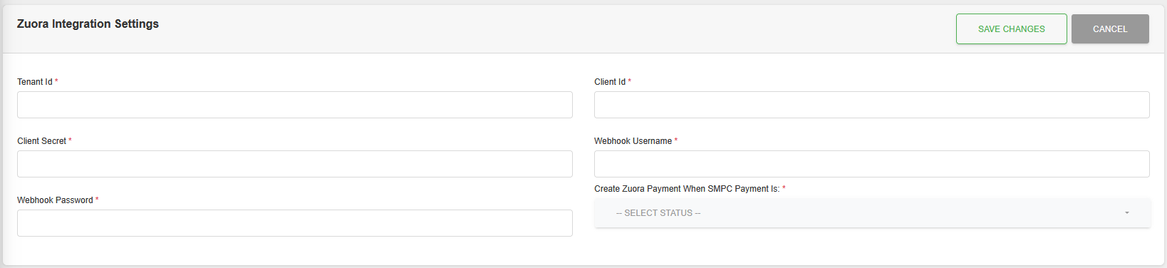 Client Id | Yes | Text Box | Client Id. Used by SmarterPay to connect to Zuora. Maximum 36 characters. |